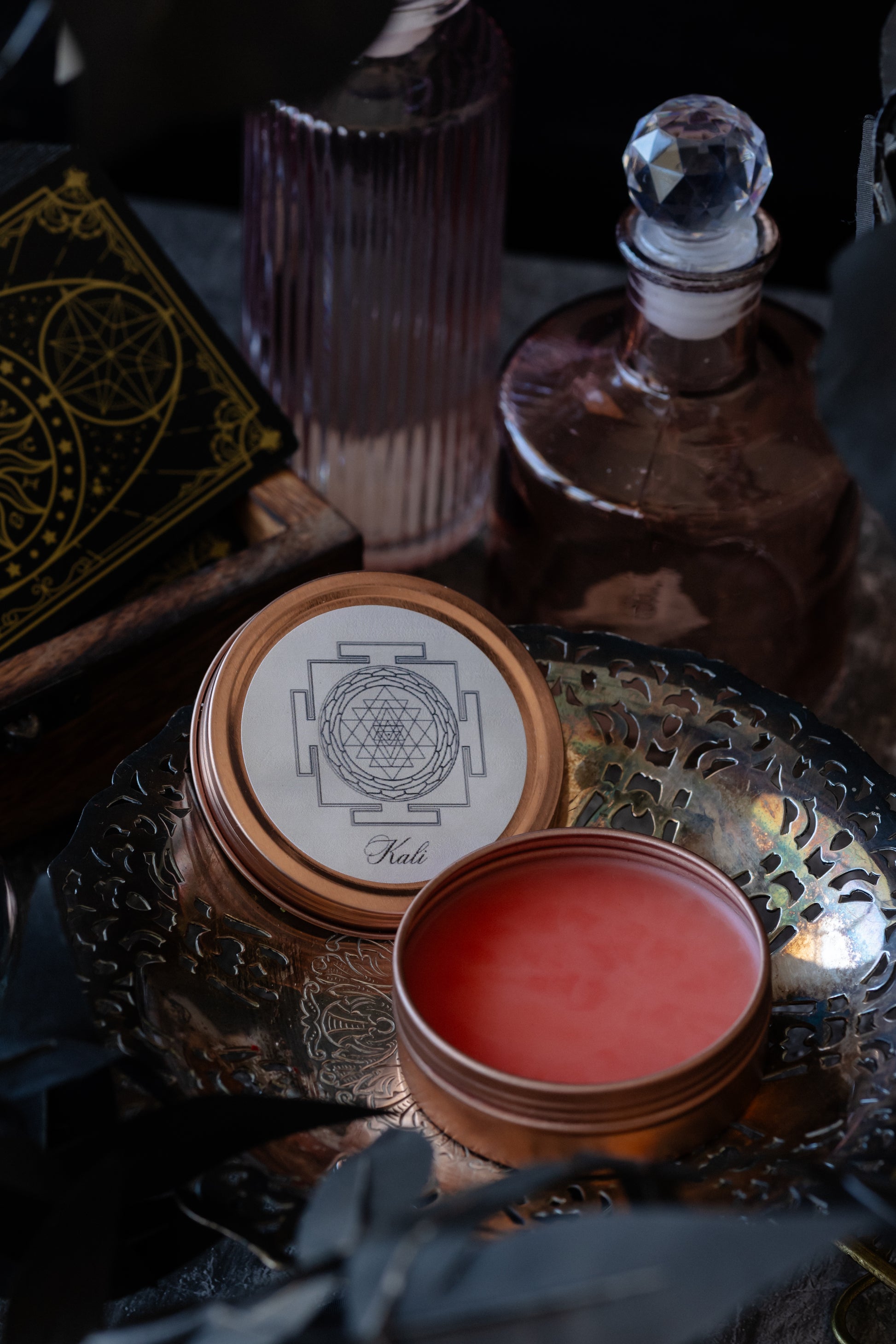 Made with coconut oil, beeswax, Vodka, Hibiscus, Hawthorn, Rose, and magick.